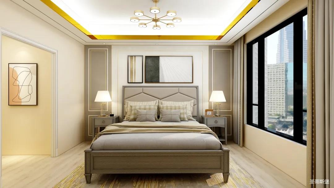 客厅延续着美式轻奢的气韵,背景墙被简约有序的金属线条分割,营造出质感空间的细腻。沙发沉稳又不失时尚,色彩混搭更是让人耳目一新,展现着美式风格天性自由不羁的浪漫个性。